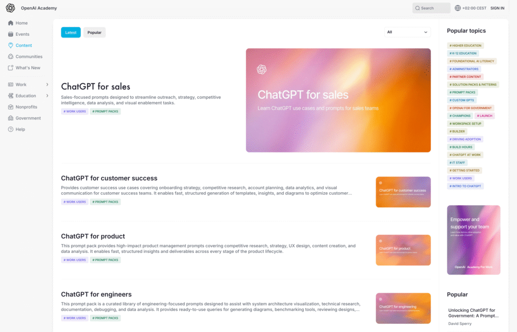 La plateforme OpenAI Academy propose aussi d’autres contenus comme des webinaires, des guides d’utilisation, des cas d’usage par secteur, si ça vous chauffe.
