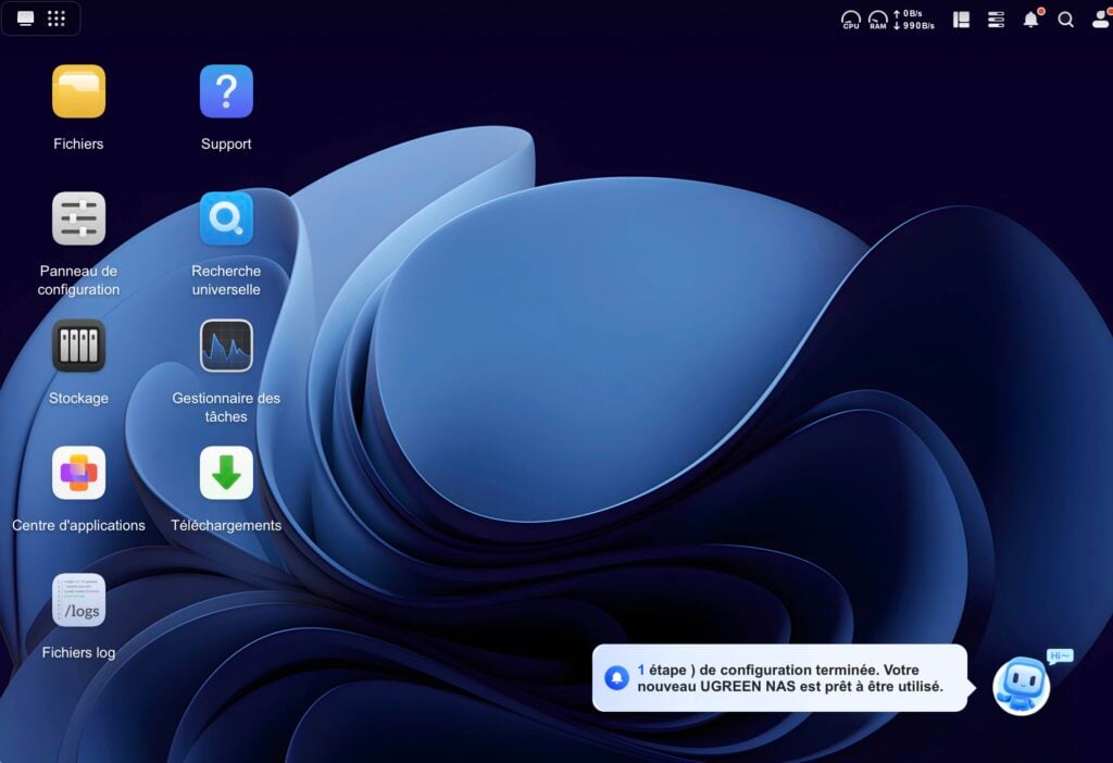 UGREEN met en avant son système “UGOS Pro”, une interface moderne, propre, qui n’essaie pas de singer Synology ou QNAP mais propose les fonctionnalités essentielles : gestion des dossiers partagés, snapshots, applications intégrées, accès à distance, partage de fichiers, et même des options avancées comme le montage NFS ou le support SMB multicanal. L’installation est rapide : on insère les deux disques, on lance l’initialisation, et on est opérationnel en moins de dix minutes. C’est simple, clair et rapide.