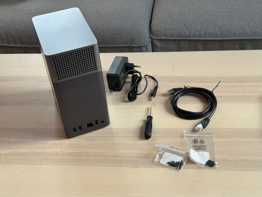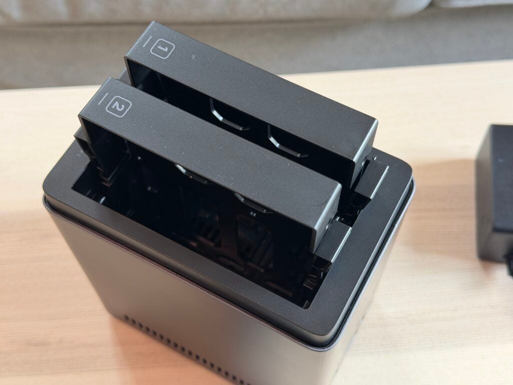 Le DH2300 est un NAS 2 baies au format vraiment miniature. Son design reste sobre, silencieux et très élégant, avec une ventilation maîtrisée qui reste discrète même lorsqu’on le sollicite un peu, contrairement à mon NAS Synology. À l’intérieur, on trouve un processeur ARM quad-core associé à 4 Go de RAM, ce qui le place dans la catégorie des NAS “grand public” mais suffisamment musclés pour encaisser une utilisation quotidienne variée : sauvegardes Time Machine, petites VM, hébergement de fichiers ou serveur multimédia.